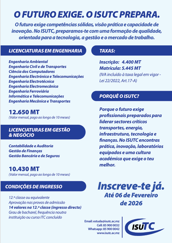 O ISUTC prima por um ensino com qualidade e rigor.Os cursos são bivalentes e certificados pelo CNAQ. O corpo Docente é altamente qualificado. Temos uma taxa de empregabilidade de 100%.